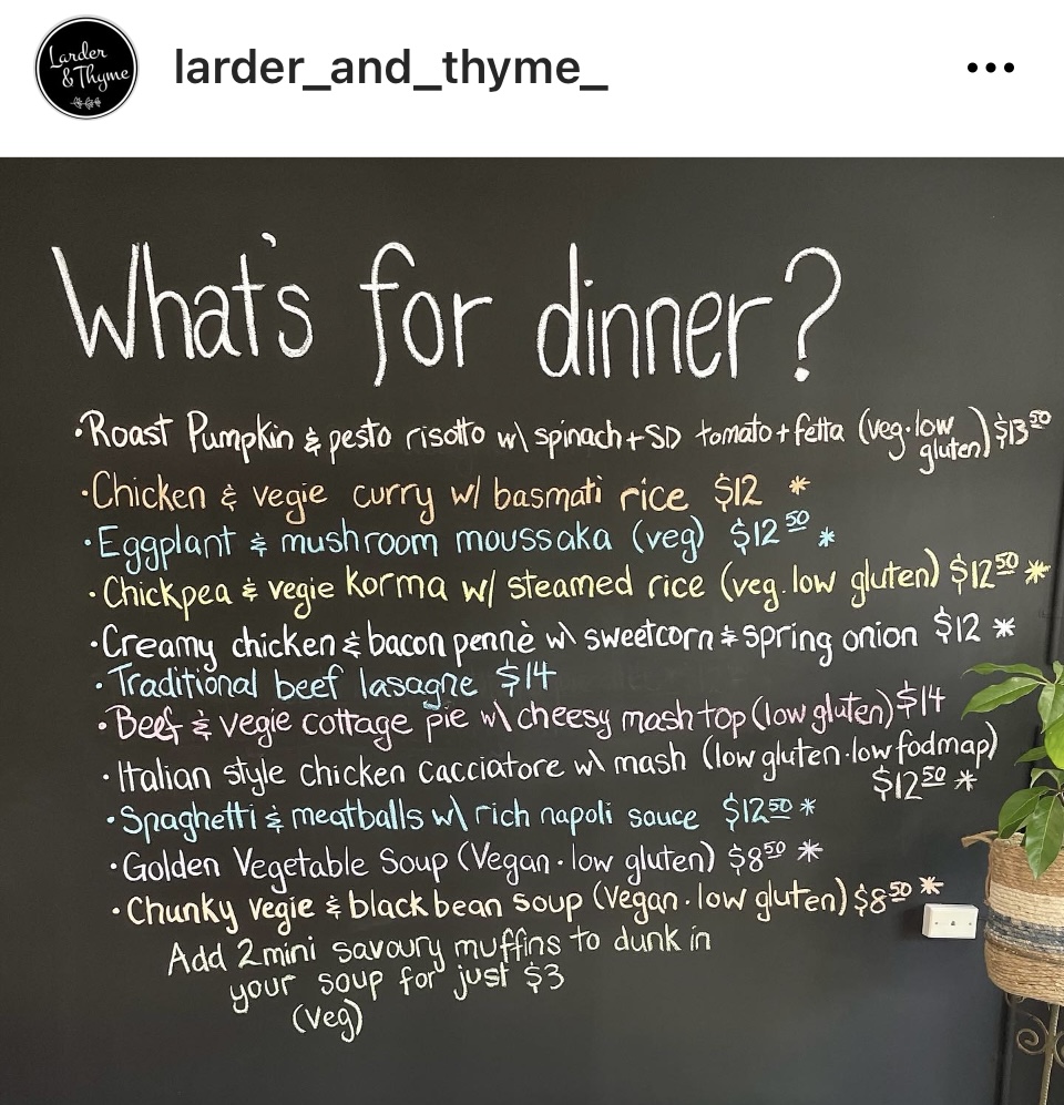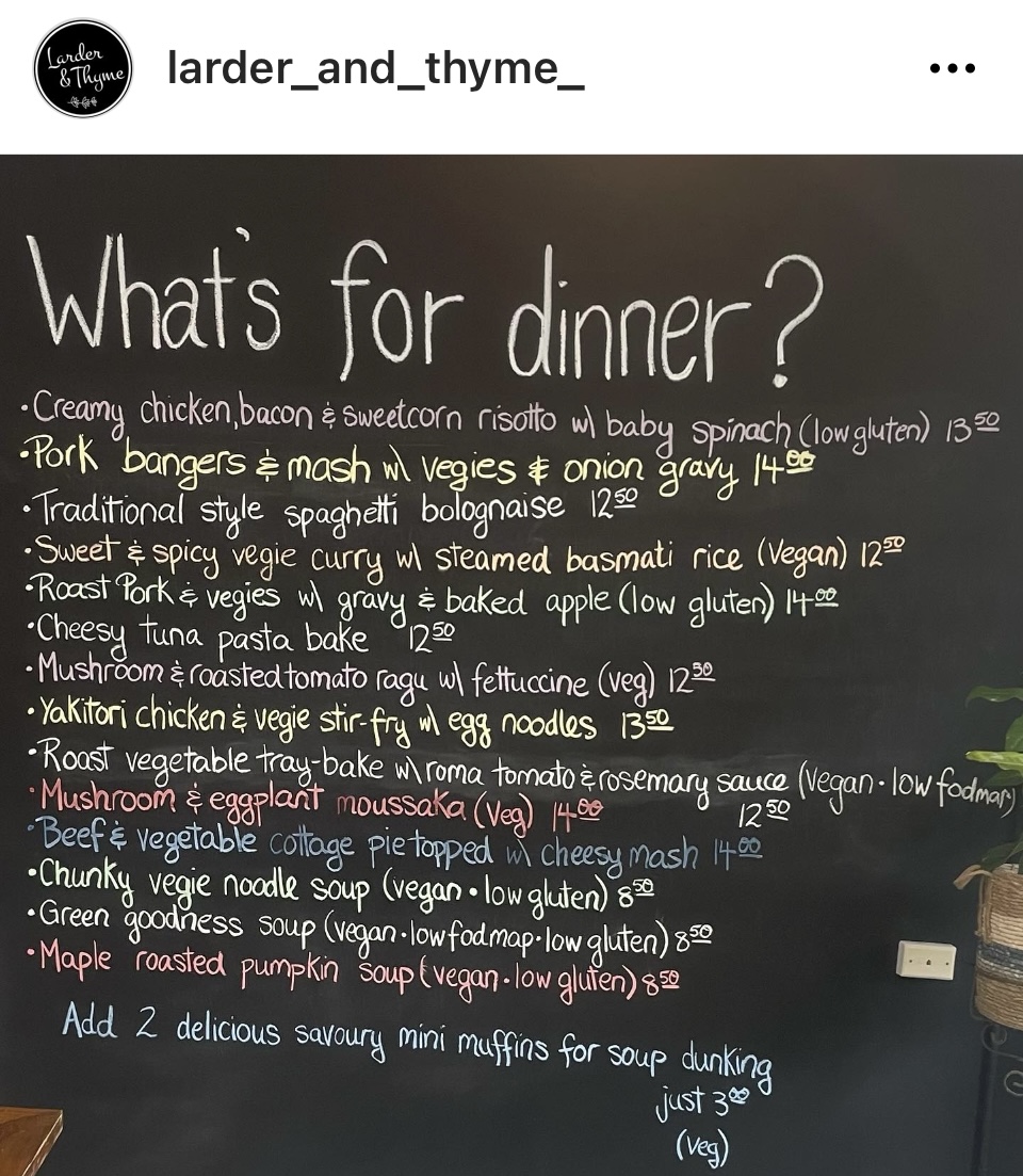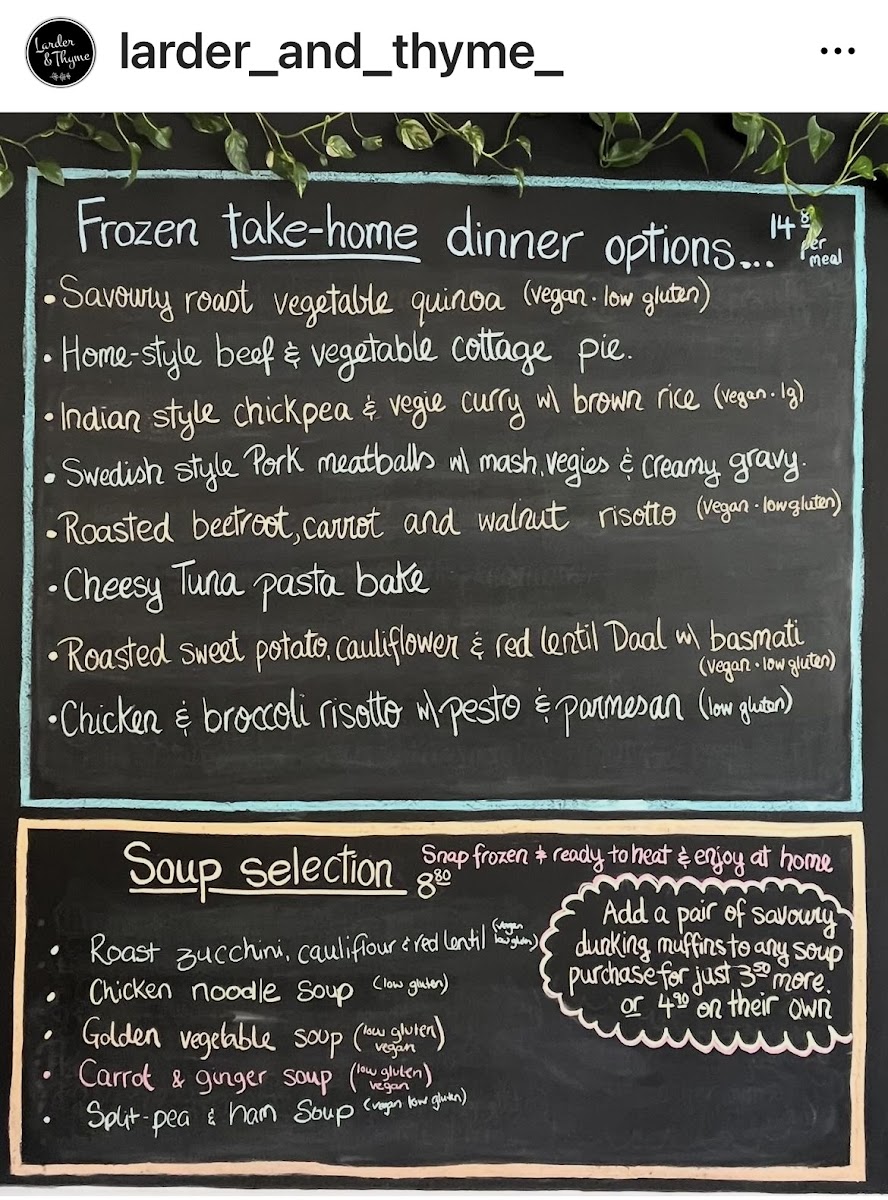 The menu at Larder & Thyme Ferntree Gully offers a variety of options suitable for different times of the day, including breakfast, coffee breaks, and light meals. The selection is organized into categories encompassing hot and cold beverages, soups, and convenient frozen ready-to-heat meals.